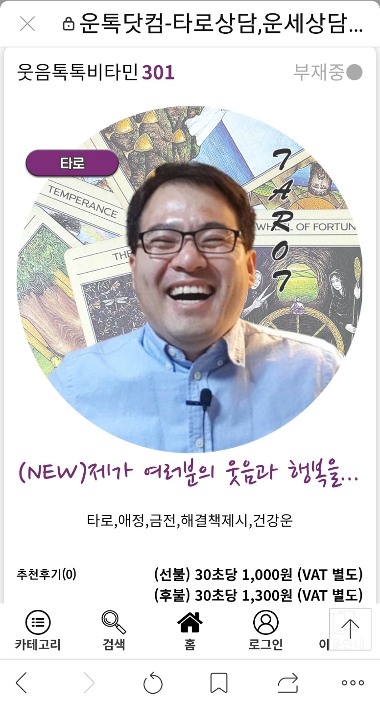 운톡닷컴에서 웃음톡톡비타민으로 타로심리전화상담을 하고 있습니다. 답답한 마음을 풀어주는 일을 하고 있습니다.