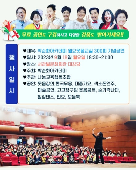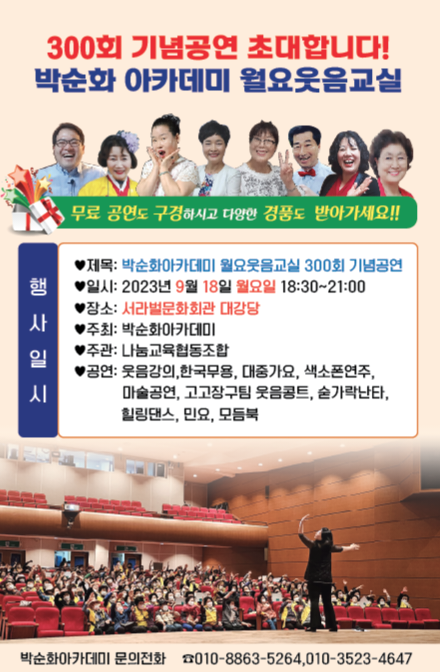 박순화아카데미 300회 월요웃음교실 기념공연이 서라벌문화회관에서 열립니다