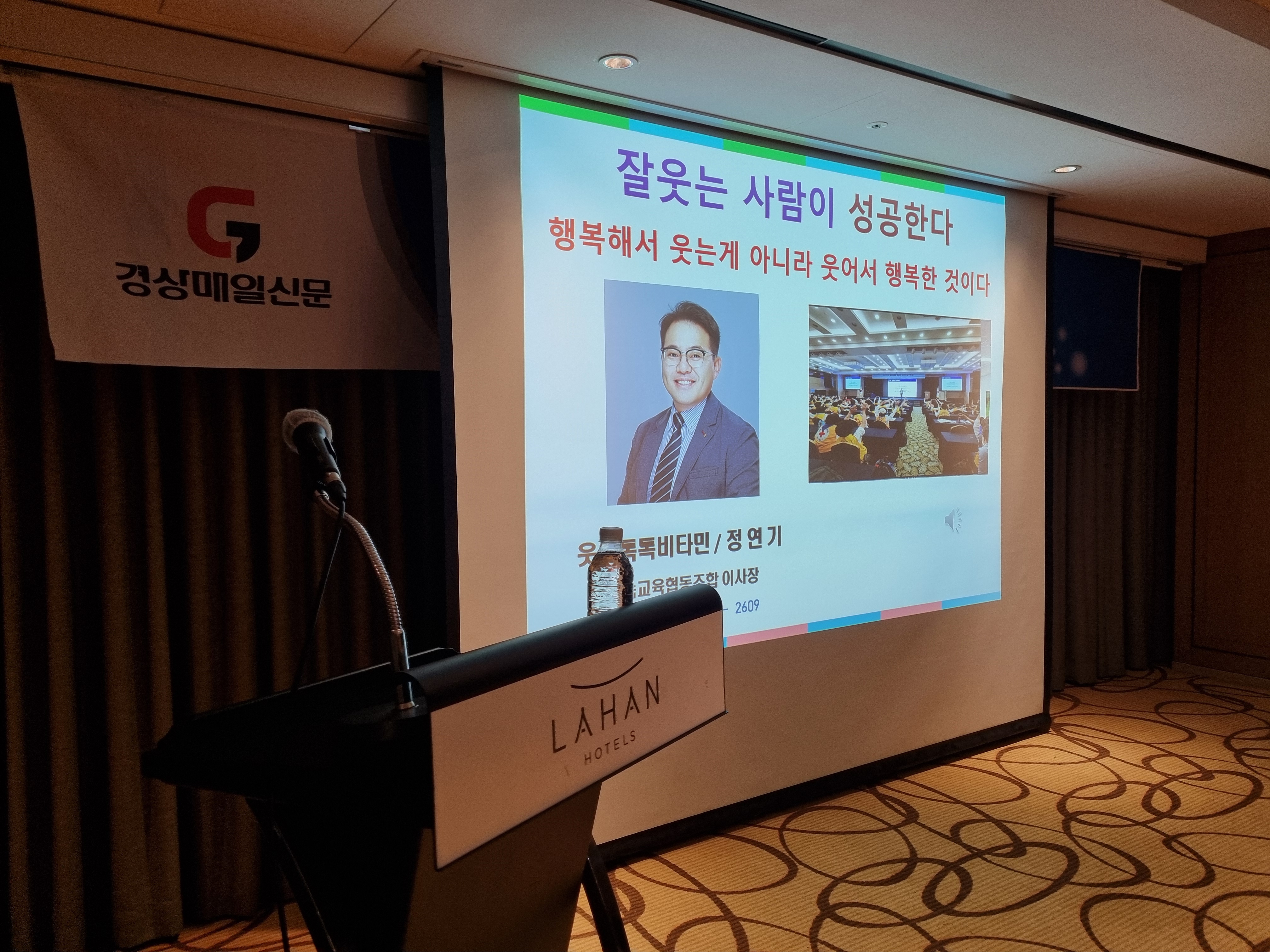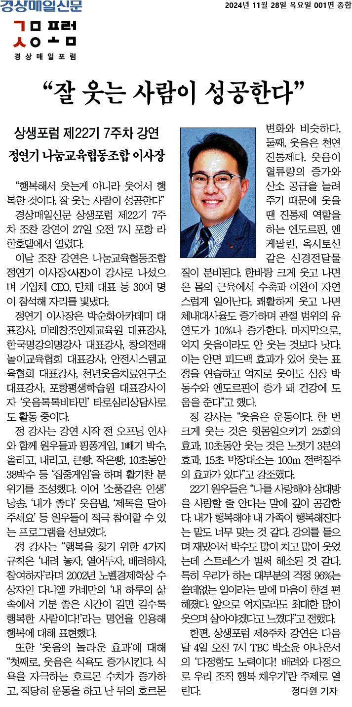 제22기 경상매일신문 상생포럼 7주차 웃음특강 조찬 강의에 잘 웃는 사람이 성공한다 라는 말처럼 모든분들이 많이 웃고 행복했으면 좋겠습니다.