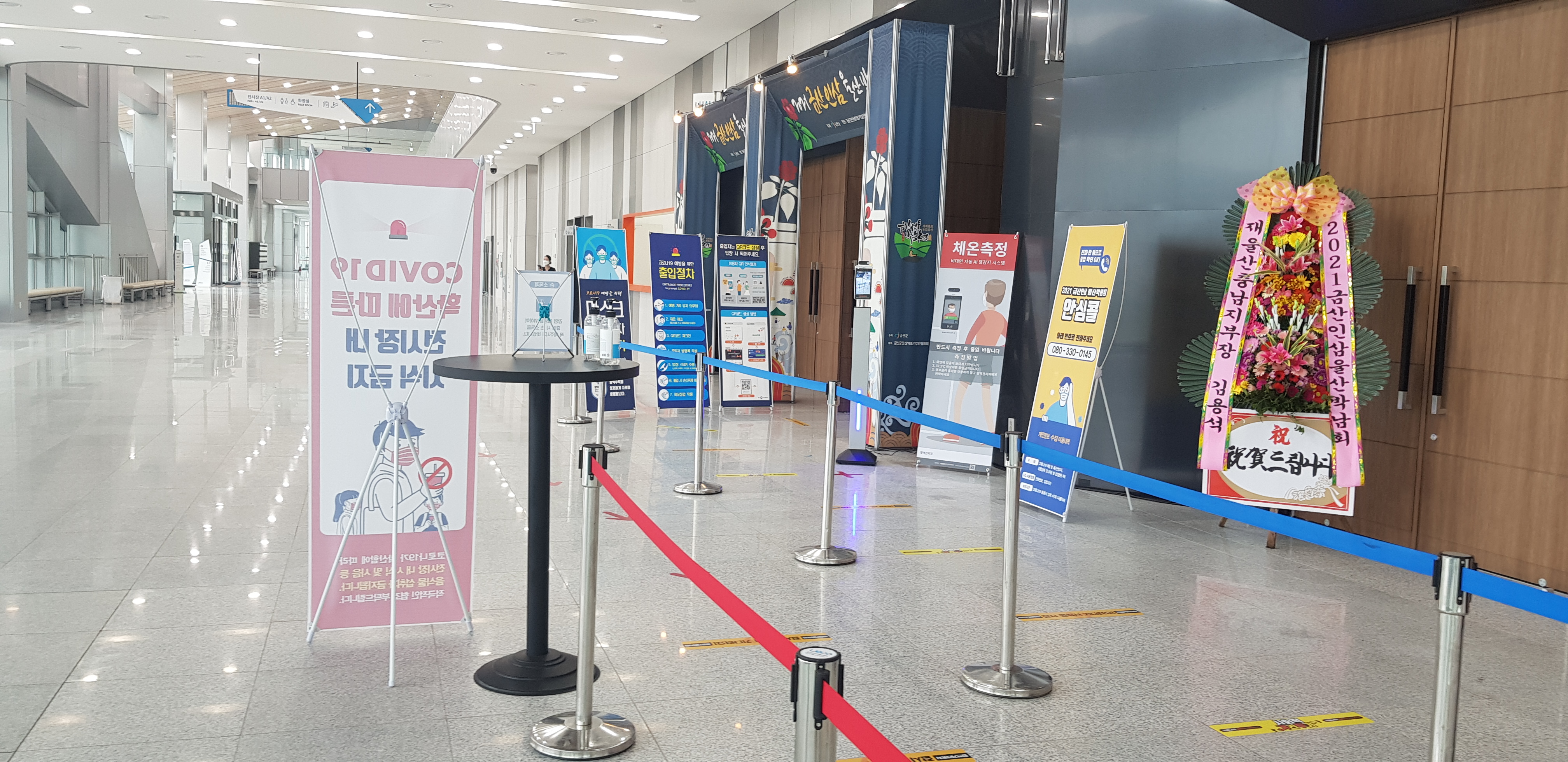 도착시 울산전시컨벤션센터 방역을 담당하시는 보안요원의 안내를 받고 먼저 손소독제, 전신소독기통과 080콜체크인를 한다음 1층행사장으로 고고~