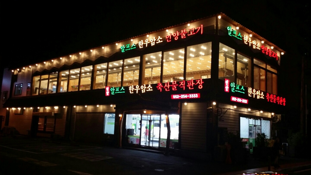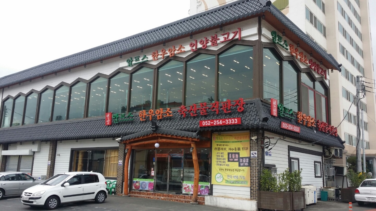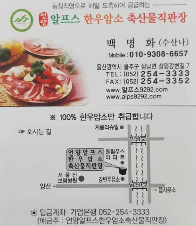 먼저 주소는 울산광역시 울주군 삼남면 상평강변길 7 에 위치한 알프스 한우 암소 언양불고기, 알프스 한우 암소 축산물직판장에 나와 있습니다.