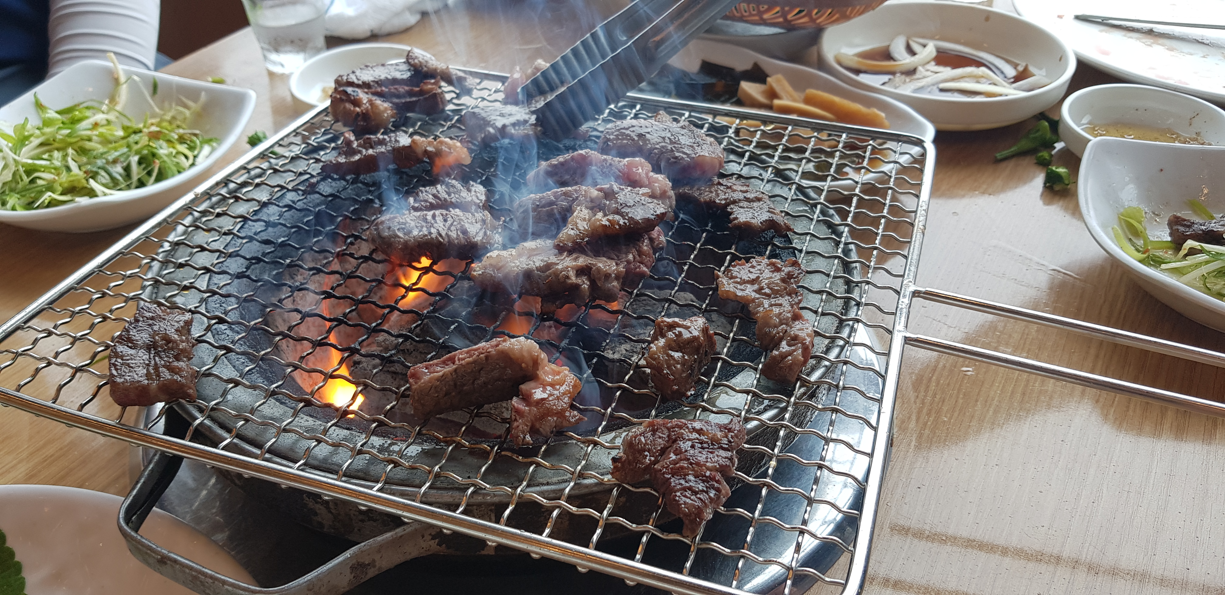 잘~ 달궈진 숫불에 고기를 올려봅니다.