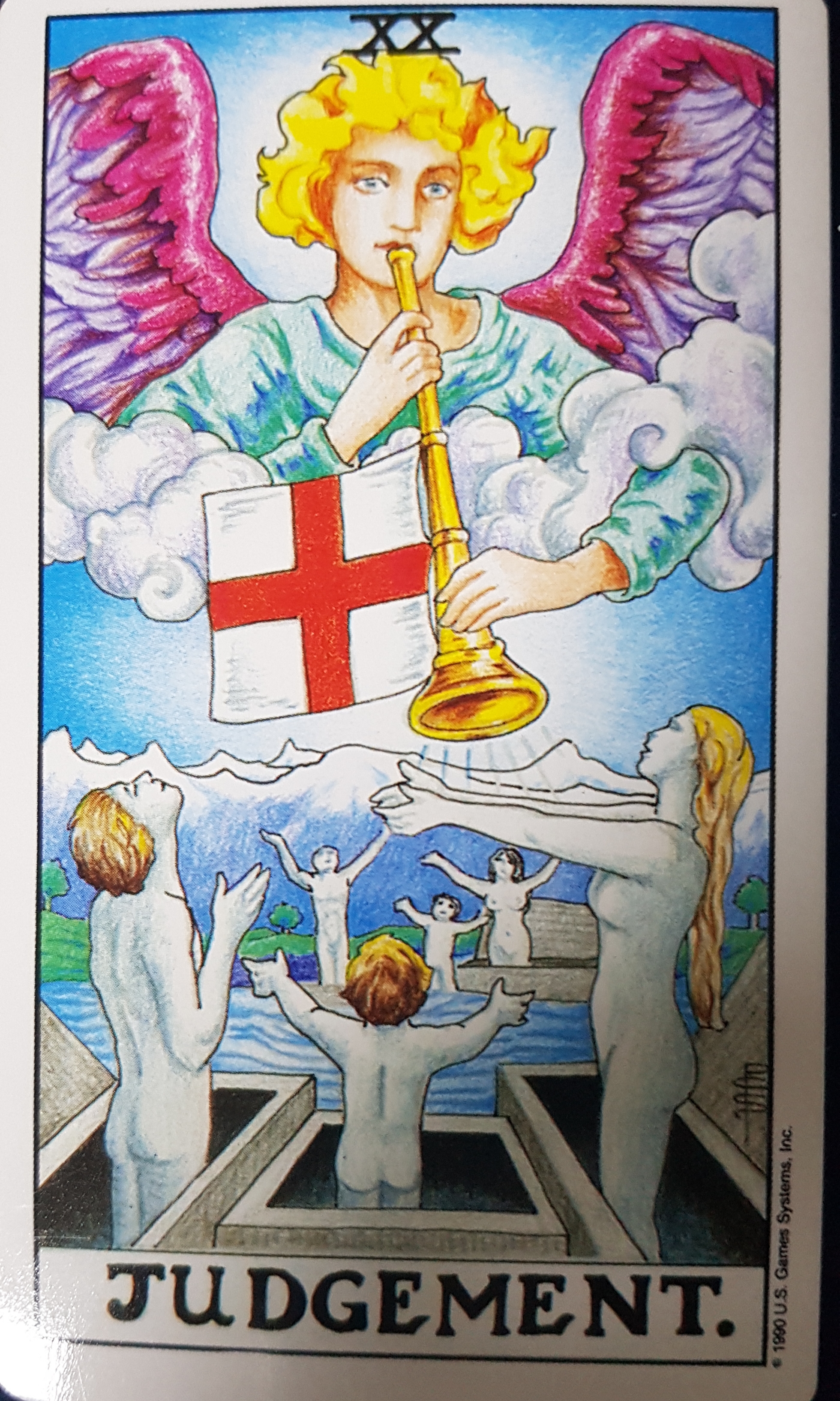 카드중앙에는 나팔을 부는 천사가 있고 성서의 최후의 심판을 모티브로 한 카드입니다.