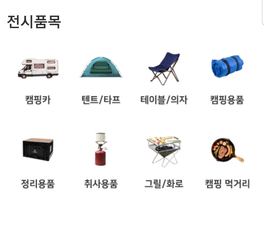 2. 캠핑.차박용품: 텐트, 타프, 캠핑퍼니처, 취침용품, 취사도구, 조명기구, 디지털기기, 위생용품, 안전장비 등